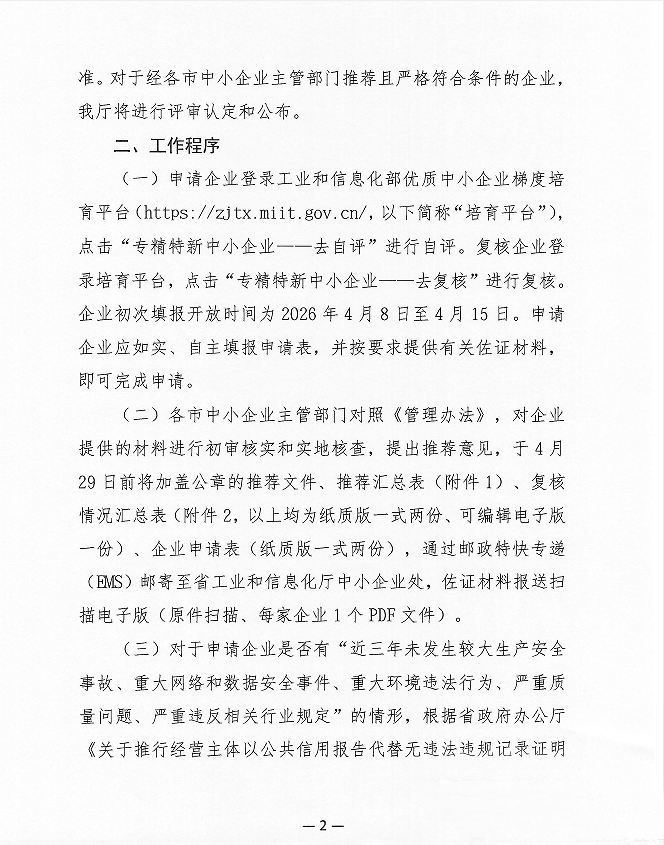为深入贯彻习近平总书记关于“激发涌现更多专精特新中小企业”的重要指示精神,落实优质中小企业梯度培育相关要求,近日,山东省工业和信息化厅发布通知,正式部署2026年度专精特新中小企业认定和复核工作,明确申请对象、工作程序及相关要求,规范认定复核流程,助力培育一批具有专业化、精细化、特色化、新颖化特质的优质中小企业。现将通知转发如下: