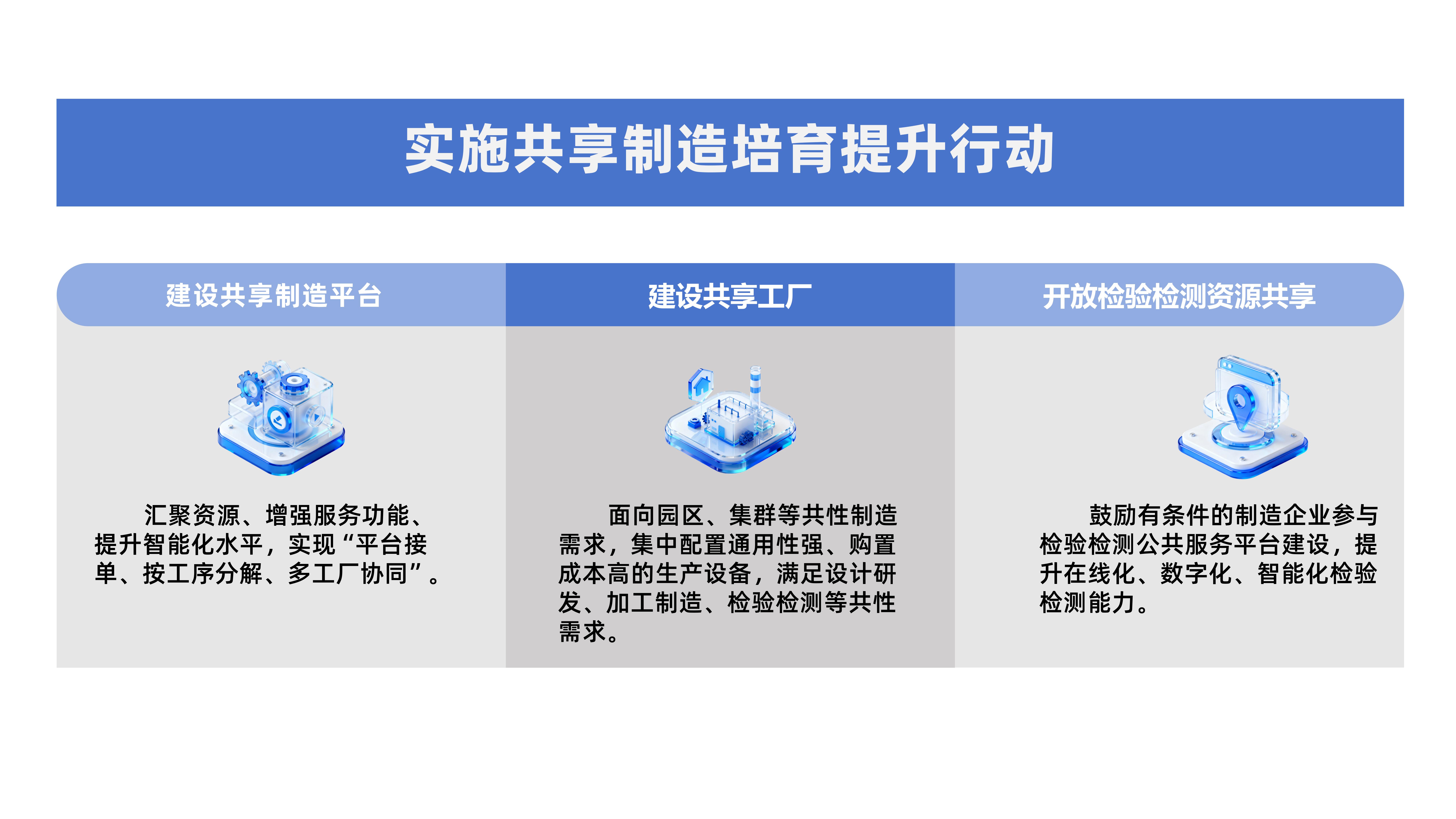 实施共享制造培育提升行动,一是建设共享制造平台,汇聚资源、增强服务功能、提升智能化水平,实现“平台接单、按工序分解、多工厂协同”。二是建设共享工厂,面向园区、集群等共性制造需求,集中配置通用性强、购置成本高的生产设备,满足设计研发、加工制造、检验检测等共性需求。三是开放检验检测资源共享,鼓励有条件的制造企业参与检验检测公共服务平台建设,提升在线化、数字化、智能化检验检测能力。