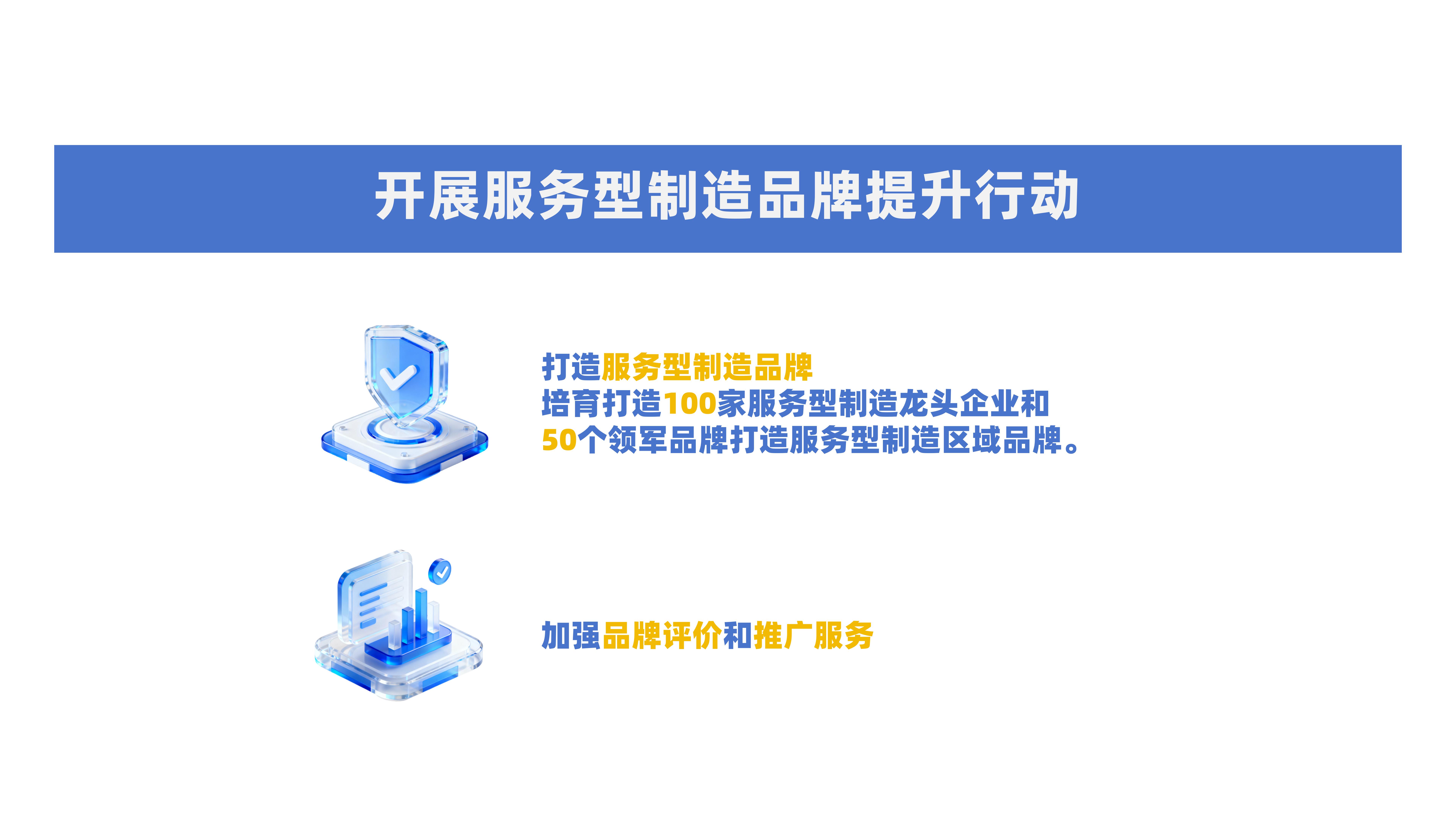 为充分发挥企业主体作用,拟通过开展服务型制造品牌提升行动,培育壮大一批服务型制造龙头企业和领军品牌,在各行业各领域中更好地发挥引领带动作用,营造服务型制造发展的良好氛围。重点面向制造业企业、生产性服务业企业和区域,打造服务型制造品牌。