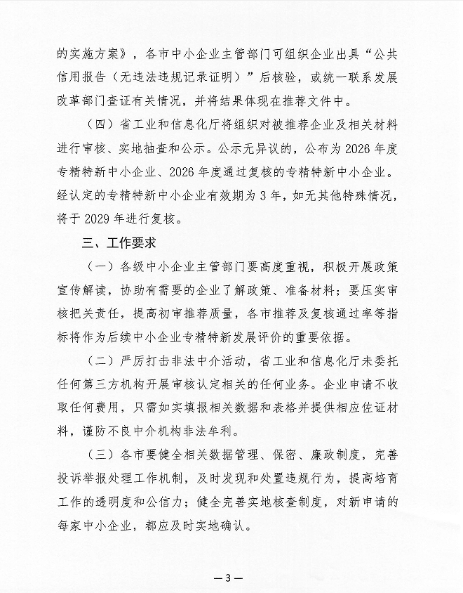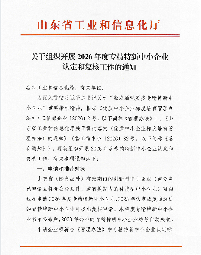 为深入贯彻习近平总书记关于“激发涌现更多专精特新中小企业”的重要指示精神,落实优质中小企业梯度培育相关要求,近日,山东省工业和信息化厅发布通知,正式部署2026年度专精特新中小企业认定和复核工作,明确申请对象、工作程序及相关要求,规范认定复核流程,助力培育一批具有专业化、精细化、特色化、新颖化特质的优质中小企业。现将通知转发如下: