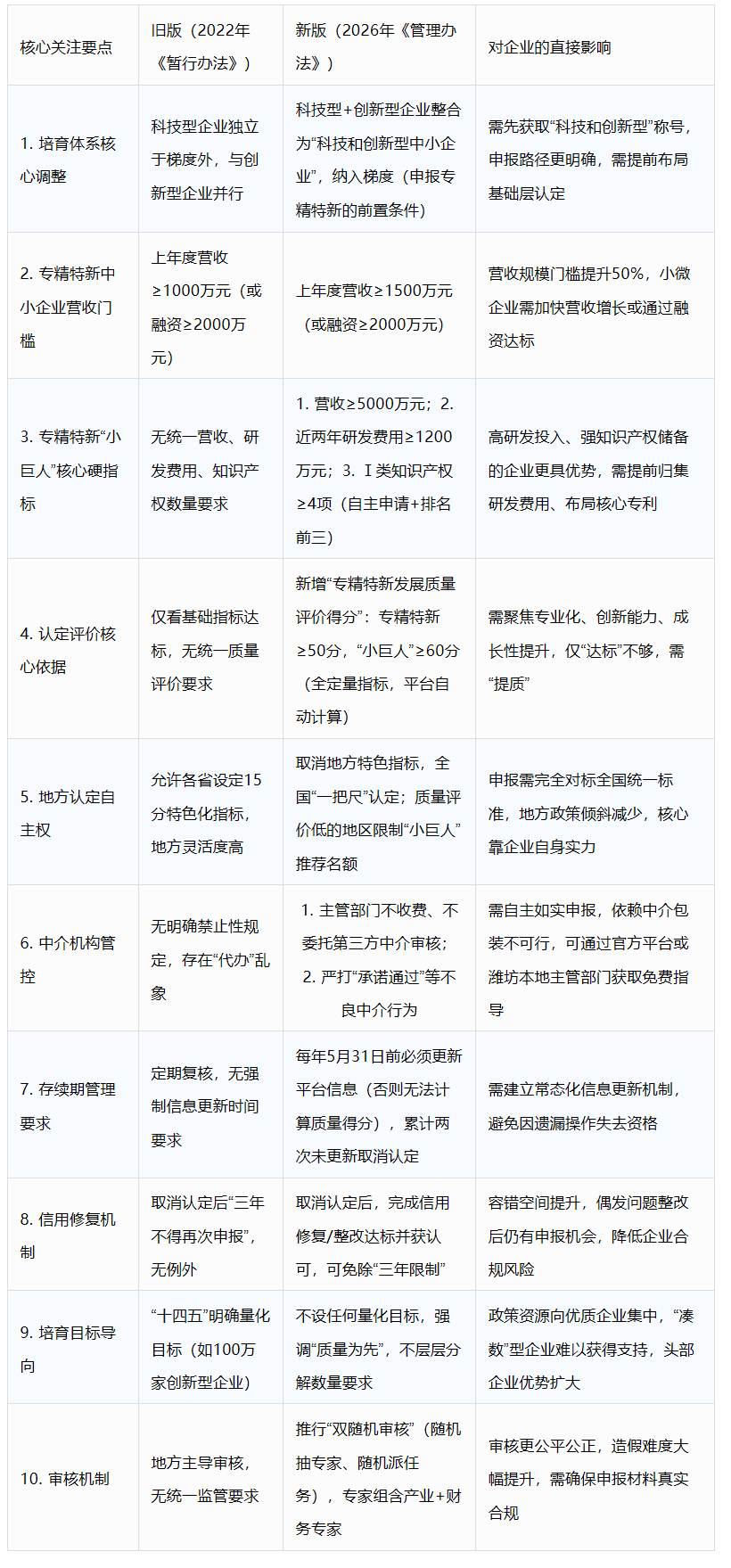 此次《优质中小企业梯度培育管理办法》的修订,并非简单的标准调整,而是我国中小企业培育战略的系统性升级。从分散培育到闭环体系、从地方灵活到全国统一、从数量导向到实效优先,三大转变始终围绕“提质增效”核心,既通过严苛的硬门槛和科学的质量评价,筛选出真正具备核心竞争力的优质企业,又通过优化服务、完善容错机制,为企业发展营造更规范、更公平的环境。对潍坊制造业企业而言,新政既是挑战也是机遇。未来,企业需摒弃“达标即可”的惯性思维,聚焦细分赛道深耕细作,加大研发投入、筑牢知识产权壁垒、提升经营质量,同时严格遵守常态化信息更新、自主如实申报等要求,主动对接官方培育服务资源。地方层面也将围绕培育质量优化资源配置,推动政策红利向硬核创新企业集中。最终,通过政策引导与企业发力的双向奔赴,助力中小企业在产业链强链补链中发挥更大作用,为新型工业化建设注入强劲动力。
